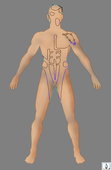 5) Следующий этап и самый главный - рисование мышц. Пользуясь мышечной сеткой, которую я заранее нарисовала, я обводила нужные мне мышцы пером, как показано на рисунке, а потом, щелкнув на правую кнопку мыши, выбирала пункт "Сделать выделенным" (Make selection) и закрашивала выделенные области кистью. Можно конечно же не пользоваться пером, а выбирать области инструментом лассо. Но для меня перо было более удобным и универсальным, так как оно позволяет делать любые линии - как гнутые, так и прямые.
