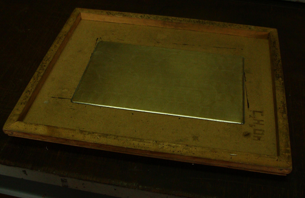 После этого пластина шлифуется; верхняя сторона (на которой будет производится гравировка) обрабатывается абразивными материалами, удобнее всего использовать наждачную бумагу, от нулевки и мельче, у меня себя хорошо зарекомендовали бумаги с маркировками 800 и 1200. Шлифуется пластина равномерными движениями в одном направлении, до тех пор, пока не получится ровная однообразная поверхность нужной шероховатости. Можно также использовать для этого всякие механические приспособления; шлиф машины, болгарки, и другой подобный инструмент. Есть мнение, что пластину нужно обязательно шлифовать до зеркальной поверхности, но, на мой взгляд, это не всегда уместно. Дело в том что зеркальная поверхность позволяет при набивке пластины вытирать ее до полного отсутствия краски на некоторых участках, что в свою очередь дает чистый цвет бумаги на этих местах, но иногда работа не предусматривает сильных контрастов и предполагает сохранение некоторого общего тона, тогда, на мой взгляд, уместно сохранить некоторую шероховатость на поверхности пластины, краска будет задерживаться в шероховатостях и давать тон степень насыщенности которого будет зависеть от степени шероховатости (ест манеры где пластину специально офактурят, и строят изображения от степени зафактуренности, это такие как меццо-тинто, акватинта.)